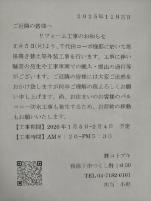 2026年01月06日(火) リフォーム工事のお知らせ 下記の日程でリフォーム工事が行われます。 工事期間:2026年1月5日 ~ 2026年2月4日 工事時間:AM8:20 ~ PM5:30 工事期間中ものせ接骨院は通常通り営業しています。 ご迷惑をお掛け致しますが宜しくお願いします。 一覧へ戻る
